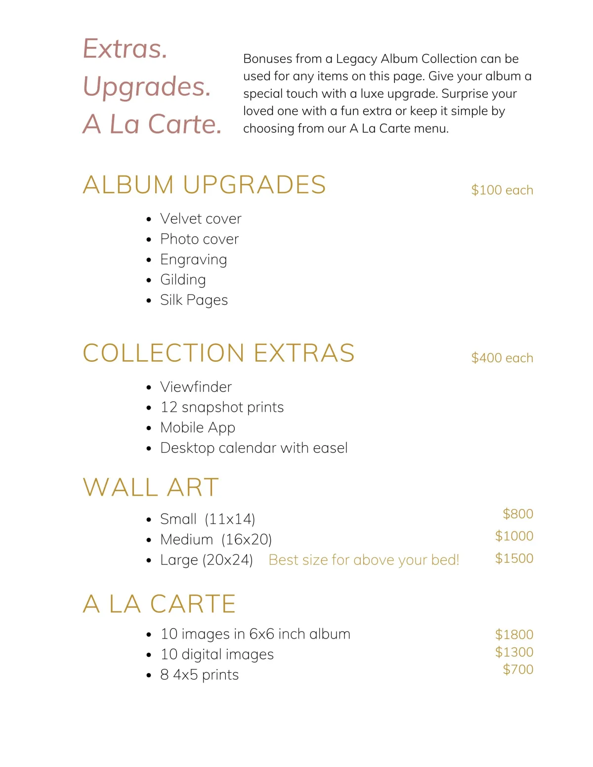 A la carte: 10 images in a 6x6 inch album $1800, 10 digital images $1300, 8 4x5 mini prints $700. Album Upgrades $100 each: Velvet cover, Photo cover, Engraving, Gilding. Collection Extras $400 each: Viewfinder, 12 snapshot prints, Mobile App. Framed Wall Art, Canvas or Metal Small $800, Medium $1000, Large $1500. Add additional image to any collection for $100. Replace album in collection for 5 additional digital images. Replace digital download in collection for 5 additional images in album.