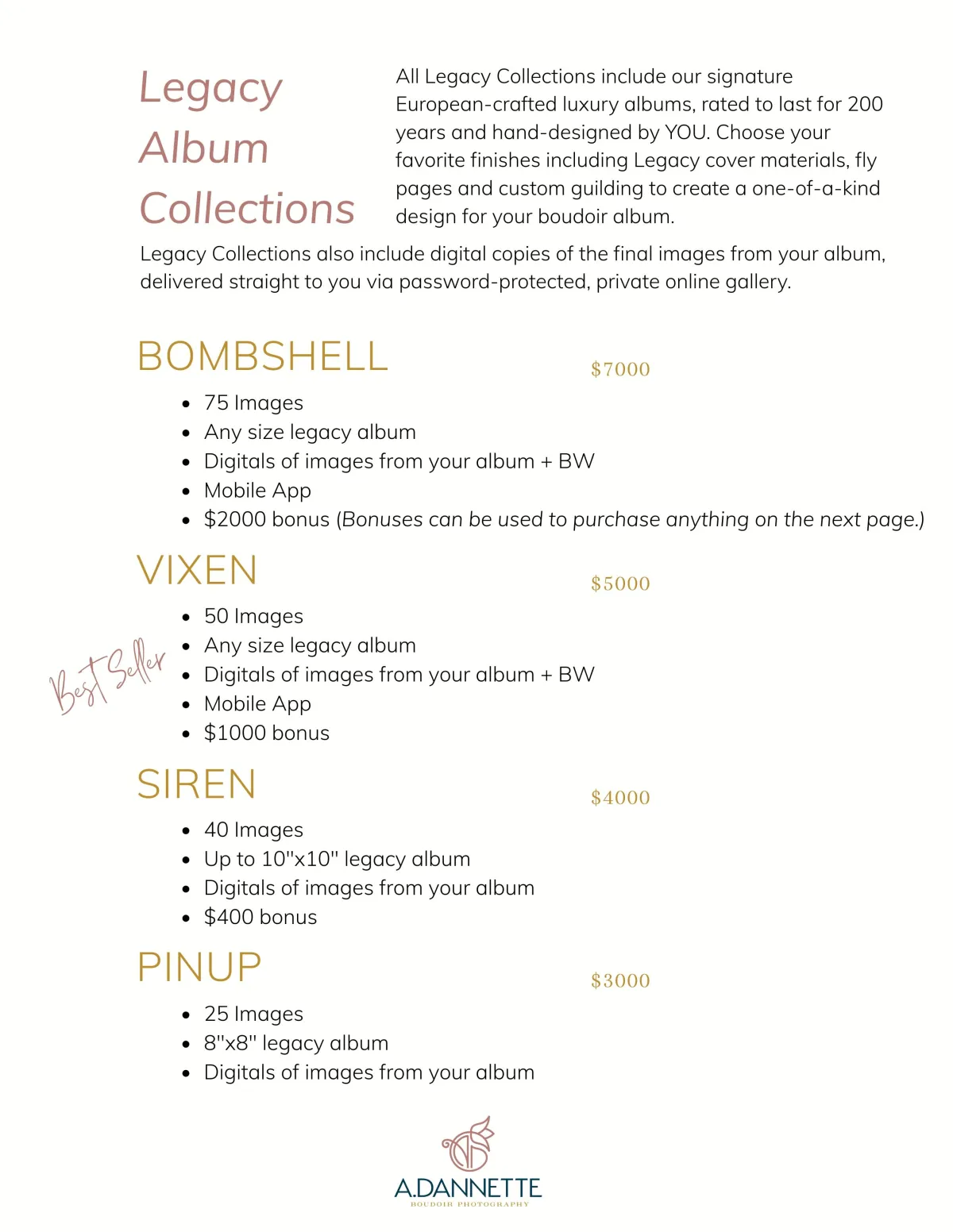 Collections: $7000 75 images in a legacy album – choose any size. Digital download of corresponding images in color and black & white + app, $2000 in collection bonus. $5000 50 images in a legacy album – choose any size. Digital download of corresponding images in color and black & white + app, $1000 in collection bonus. $4000 40 images in a legacy album - up to 10x10 inch size. Digital download of corresponding images in color, $400 in collection bonus. $3000 25 images in a legacy album - 8x8 inch size. Digital download of corresponding images. Collection bonus expires 30 days after photoshoot date.